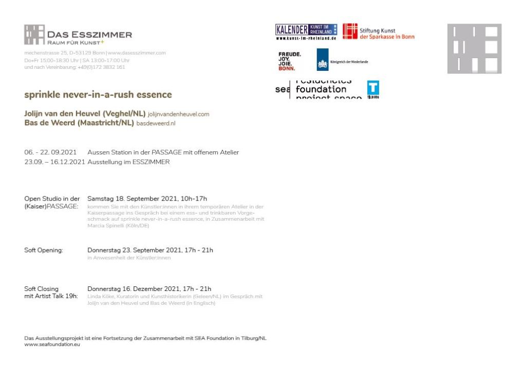 This exhibition project was realized in collaboration with Sea Foundation Tilburg and with the support of the cities of Tilburg and Bonn, der Sparkasse in Bonn, Kalender:Kunst im Rheinland and the embassy of the Netherlands in Germany